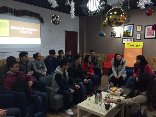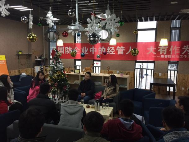 在学院W&M咖啡屋进行了经致工作坊启动仪式,并邀请中航工业成都飞机工业(集团)有限责任公司人力资源部贾宇航主任和宋颖老师,以“国防企业中的经管人,大有作为”为主题,进行了近两个小时的主题交流,学院副院长朱建军、党委副书记许静、管理科学与工程系系主任马静、负责学院职业生涯规划教育的辅导员庞依达与近二十名本科生研究生参加了此次工作坊。
