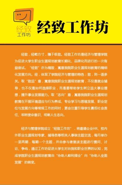 职业生涯规划教育的精细化发展方向。经,体现了学院经济与管理的特色;致,则一语多关。取“致远”意,寓意漫画柜