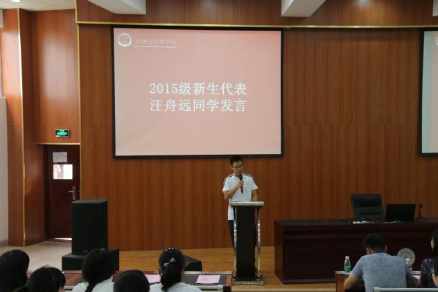 2015级本科生新生汪舟远代表新生进行发言,从大学的学习规划、时间管理、人际交流等几个方面与同学分享了作为新生来南航的感悟与目标,并借用晓校歌“效法羲和驭天马,志在长空牧群星”鼓励大家成为一位有包容气度、社会责任、敢于担当的南航经管人。