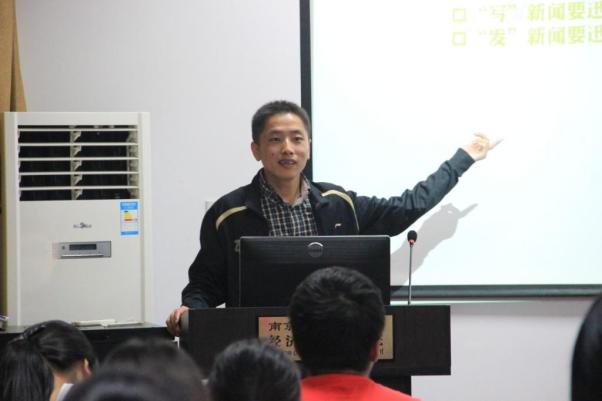 在主持人简单介绍后,王超老师以“新闻写作与编辑”为主题进行了讲授。他以提问的方式开头,引出我们的目标是“会写稿,写好稿”,并指出实现这个目标非一蹴而就,需要“步步为营,稳扎稳打,各个突破”。结合“新闻即对新近发生的事实的报道”这一经典定义,王超老师详细地讲解了新闻的基本特征——真实性、新鲜性、时效性、公开性,并针对各特征分别举出新闻实例予以解读。在提及新闻工作者职业素养时,王超老师将自己的经验总结为“杂家”精神和“七分跑、三分写”的感悟。紧接着,王超老师指出“新闻是写出来的,更是改出来的”,并通过事实的订正、辞章的修饰和改稿的程序三方面向同学们揭开了新闻稿编写的神秘面纱。王伟老师则以“新媒体培训”为主题开展了培训,他首先从媒体内容选制切入,告诉我们如何通过“用户至上、内容为王、特色致胜”三方面,在新媒体平台上做出精彩的外媒宣传。在提及媒体平台运营之时,王伟老师则强调了新媒体需要通过与传统媒体“联动”、与校内单位“联动”以及线上线下“互动”来达到合作共赢。最后,王伟老师结合多个学校官方微信公众平台成功运营的案例指出媒体人才队伍建设的重要性,并对学院微信公众平台的未来规划提出了宝贵的建议。培训后,来自漫画柜外宣记者团的董清同学,针对“如何做好校园新闻的采写”这一方面,与在场的各位同学们分享了她担任记者职务一年来所积累的宝贵验。