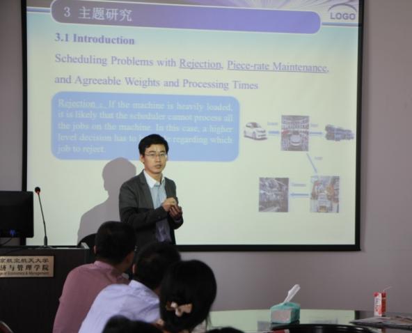 虞先玉博士介绍了求学经历及其生产运作调度研究的研究现状以及深入发展的方向,讲解了自己在考虑疲劳影响和机器维护方面的研究成果。以带有拒绝成本和维护成本的调度研究为例,虞先玉博士着重讲解了运作调度研究的主要思路和优化算法设计方法,并介绍了有关疲劳影响和能源调度等最新研究情况。