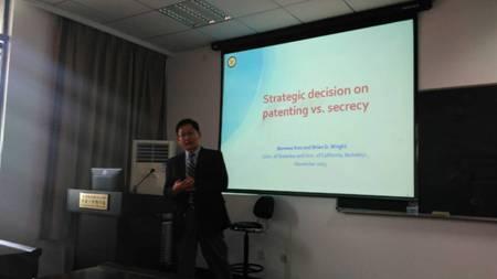 Koo教授在报告中分析了公司愿意利用商业秘密来作为投资手段,而社会则倾向于利用专利,对这两种类型权利进行保护的激励结构,设计一个最佳的知识产权政策。专利是政府授予的垄断权,在一段时间内保护一个人的创新。考虑中间研究输出导致非常不同的结果,专利可能导致重复研发投资。而对于高投资成本(吸收能力),商业秘密是一种社会控制,以限制许多其他公司的进入。商业秘密具有较短的专利寿命,具有广泛的专利范围,可以使公司的专利权得以不断创新。报告期间,多位老师同学对相应的问题进行了互动与交流,现场氛围十分活跃。