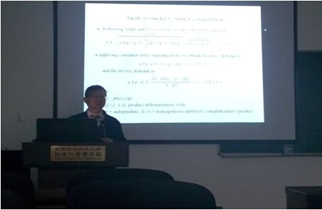 Kevin教授在报告中主要探讨了在双寡头垄断的企业中,业主和经理的战略管理激励设计对企业社会责任(CSR)的态度,他认为在Bertrand和Cournot竞争模式中,企业产品之间既能被替代,也可以是相互独立或相互补足的关系。他分析了这种管理激励机制的内生设计,然后重点研究其对企业利润和企业社会责任的战略效应,最终反映消费者剩余和社会福利。报告结束后,多位老师同学对相应的问题进行了交流,现场氛围十分活跃。他的精彩报告也给参加讲座的老师和同学带来了许多启迪与思考。最后,Kevin教授的精彩讲座在同学们热烈的掌声中圆满结束。
