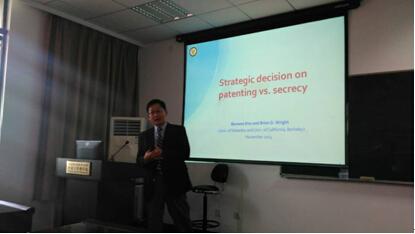 的副院长王英老师,智能决策与风险分析研究所的陈晔、陈洪转、李杰等老师,区域经济与产业经济研究所的苗建军、江可申等老师以及两所的全体研究生同学参加了此次报告。 Koo教授研究领域包括知识产权、科学技术政策、创新战略和技术管理、技术应用与扩散、遗传资源经济学、生物技术、绿色技术等。他在Journal of Financial Stability等众多国际知名期刊发表过多篇文章。 Koo教授在报告中主要分析了专利与商业秘密这两种结构,分析如何对这两种类型权利进行保护激励,设计最佳的知识产权政策。专利是政府授予的垄断权,在一段时间内保护个人创新。而商业秘密是一种社会控制,以限制许多其他公司的进入。商业秘密具有较短的专利寿命,具有广泛的专利范围,可以使公司的专利权得以不断创新。报告期间,多位老师同学对相应的问题进行交流,现场氛围十分活跃。他的精彩报告给参加讲座的老师和同学带来了许多启迪与思考。最后Koo教授的精彩讲座在全场同学们热烈的掌声中圆满结束。