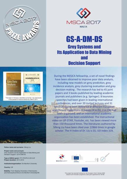 据悉,在2017年欧盟居里夫人计划学者奖评审中,我校刘思峰教授获“10位最有为科学家奖”(10 shortlisted promising scientists in the MSCA 2017 Prizes),是欧盟居里夫人国际人才引进计划实施以来首位获奖的中国学者。