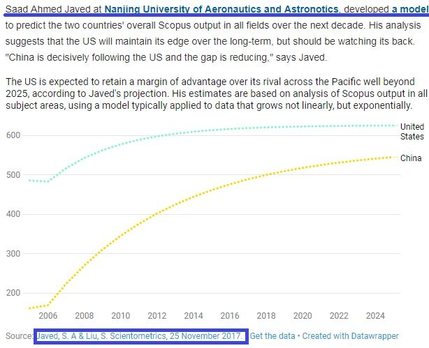 这篇新闻报道文章大篇幅引述了我校来自巴基斯坦的博士研究生Saad Ahmed Javed和刘思峰教授2017年11月25日在线发表在Scientometrics上的题为Predicting the research output/growth of selected countries: application of Even GM (1, 1) and NDGM models文章的研究成果。我校这篇文章运用均值GM (1, 1)和非齐次离散灰色预测模型对中美两国未来10年的各领域研究产出进行预测,得到了如下结论:美国的发展势头虽然有所趋缓,但仍将长期保持自己的优势;中国将紧追美国且差距日益缩小。这一预测受到自然指数(Nature Index)著名评论家Smriti Mallapaty的重视和认可,并在其新闻报道重磅文章中大段引述。