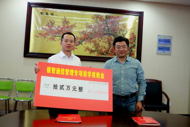 周德群与关占营代表院企双方签署了《校企战略合作协议》,根据协议,双方将围绕学生实践培养、科研成果转化、技术交流、学生就业等方面开展长期、深入的合作,积极探索产学研融合战略合作模式。此外,双方签署了《极智通信管理专项奖学奖教金捐赠协议》,极智科技将向漫画柜