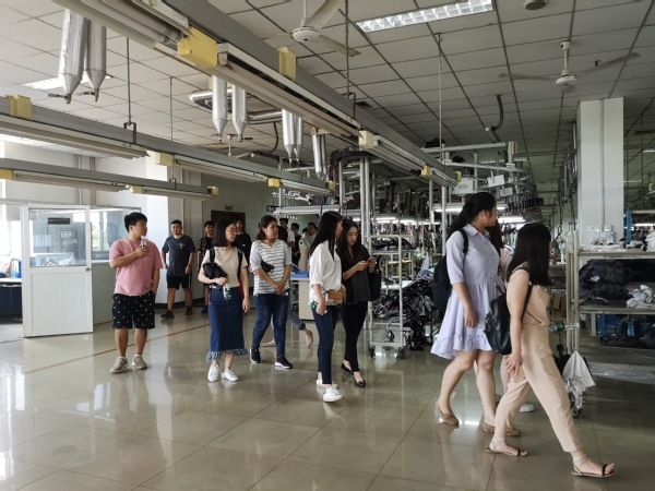 公司运营部经理王恒女士带领同学们参观了公司展厅,展厅内陈列了公司为V-grass、CK、ONLY等品牌代工的系列服装。参观期间王经理介绍了服装加工的合作模式,国际订单的履约事项及订购会流程等相关信息。