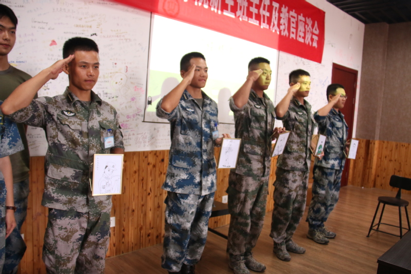 座谈会上,辅导员胡心雨以“大数据”的形式介绍了2018级新生的整体情况,并从敢想、敢为、敢担当三个方面介绍了学生的个性特点。2018级团总支书记胡悦芝、哈萨克族学生达吾兰、体育生孙辰浩代表全体新生为每位教官送上了同学们自己绘制的教官个人画像,表达了对教官辛苦付出、学院老师无微不至的关爱的感谢。军训教官向参会老师们介绍了漫画柜 新生的军训情况,他们分享了漫画柜 新生集体荣誉感强、不怕苦不怕累、性格活泼、才艺丰富等特点。针对学生特点,班主任和教官进行了深入而细致的讨论,为军训结束后班主任的学生培养工作提供帮助。涂志宏代表学院肯定了新生不畏艰苦、坚持训练的优良作风,并对军训团教官表示了感谢。