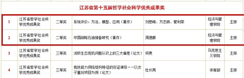 第三次以第一完成单位获得教育部科学技术奖。同年,刘思峰教授团队申报的《系统评价:方法、模型、应用(著作)》和周德群教授团队申报的《中国战略石油储备研究(著作)》获得江苏省哲学社会科学优秀成果二等奖。