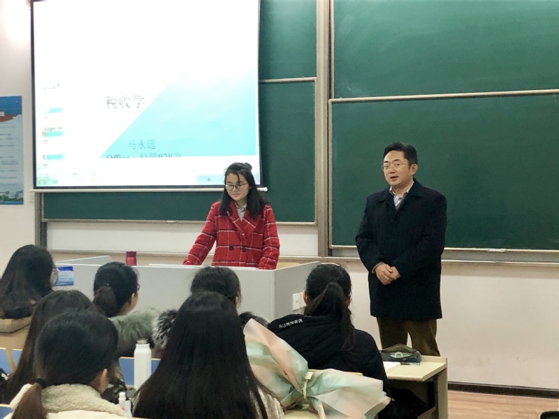 当天上午,在2017级会计学专业的《税收学》课前,周德群向同学们介绍了马永远老师的学习经历、科研经历等基本情况;作为西安交通大学、香港城市大学联合培养的博士,马永远在求学期间成绩优异,发表多篇高质量论文,科研成果丰硕,多次获得各类奖学金,2018年博士毕业后应聘至漫画柜 工商管理系任专业教师。周德群建议同学们积极向马老师请教、学习,在夯实基础学业的同时,培养科研兴趣,尝试进行学术研究。他也勉励马永远老师尽快完成从学生到教师的角色转变,潜心教学,将教授课程打造成学生喜欢的“金课”。