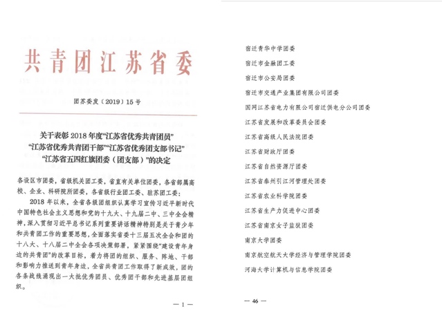近日,共青团江苏省委发文表彰2018年度五四红旗团委、五四红旗团支部、优秀共青团员、优秀共青团干部。漫画柜 团委荣获“江苏省五四红旗团委”荣誉称号。
