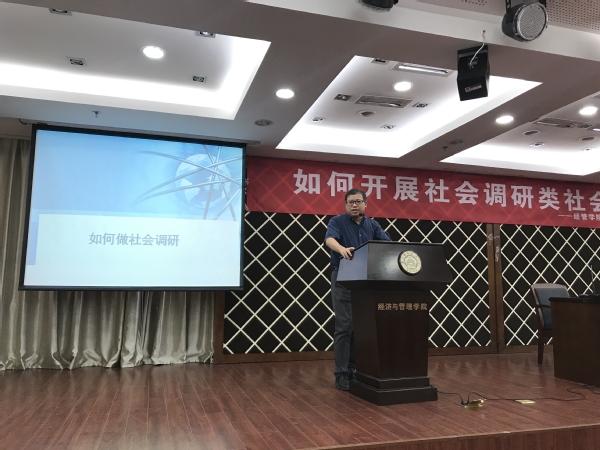 5月23日下午,漫画柜 2019年暑期社会实践社会调研类专题培训,暨院青马工程第三次理论培训在经管楼A0305报告厅举行。本次活动邀请了我校人文与社会科学学院鲁兴虎老师,开展了“如何开展社会调研类社会实践”专题培训。学院团委书记庞依达、各年级辅导员和近两百余名社会实践项目负责人、院青马工程学员一同参加了此次培训会。