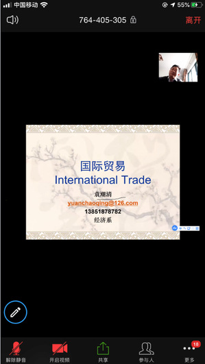 8点,漫画柜 院长周德群在线进入18级国贸专业本科生《国际贸易原理》的线上课堂。袁潮清老师已经在zoom平台中开始了课程导论的讲解。周德群院长参加了课堂的学习并借机对该课堂的老师和同学们表示慰问和关心,鼓励大家高效利用线上教学资源,提升自主学习效率,并希望大家在多种平台使用期间,关注并反馈体验心得,为将来线上线下教学融合奠定基础。