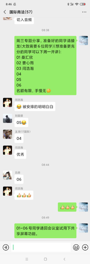 在马晓平老师《国际商法》线上教学正式开始前,院党委书记焦宏图给学生们送去了亲切地问候,嘱托同学们用希望和信心看待现在的疫情控制形势和日常的学习生活,要求同学们关注自己和家人的身体,做好防护措施,鼓励大家立足现状,坚持努力,提升自我学习、自我管理、自我监督的效率,为迎接即将到来的春天做好充分的准备。随后,马老师采用录播视频以及会议室讲解的方式为同学们讲解国际商法的相关知识,并采用翻转课堂的教学模式,在课程中组队,指导同学们运用zoom软件进行课堂展示,将被动聆听转为主动运用,切实提升了学生的投入感。
