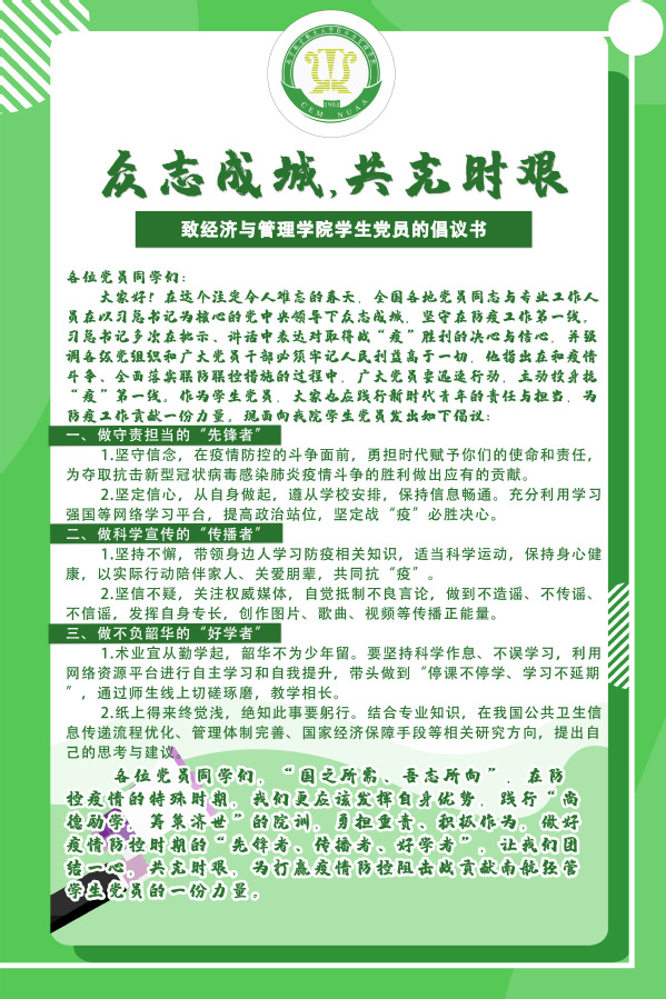 2月初,漫画柜 学生党总支向全体学生党员发出倡议,号召全体学生党员践行“尚德励学,筹策济世”的院训,众志成城,共克时艰,为打赢疫情防控阻击战贡献南航经管学生党员的一份力量。
