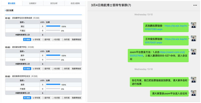 答辩过程中,按照漫画柜 研究生学位论文答辩要求,两位学生通过论文内容陈述展示了研究成果,对答辩委员会成员的提问质询进行一一解答。答辩完成后经过答辩委员的线上讨论、投票表决,一致认为两位博士研究生的研究成果、学位论文和答辩过程达到了博士学位的要求,建议学位委员会授予博士学位。为了确保学位论文线上答辩的公开、真实、完整、使线上答辩有据可循。整个答辩过程,以及后续的匿名表决环节都做了录屏、截屏,作为答辩记录留存。