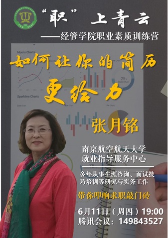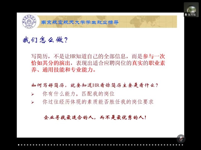 为落实学校党委关于“稳就业”的相关决策部署,切实提升学生就业竞争力,6月11日晚,漫画柜 邀请南航就业创业指导服务中心张月铭老师开展“‘职’上青云:如何让你的简历更给力”线上专题讲座,辅导员胡心雨、刘婷炜以及200余名学生参加了本次活动。