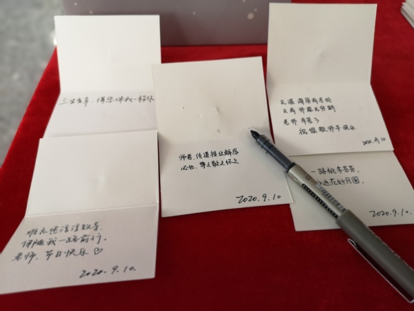 9月9日晚,漫画柜 团委学生会的同学亲手为学院全体老师手写祝福贺卡,“一路桃李芬芳,永远花好月圆”“天涯海角有尽处,只有师恩无穷期”“老师,您辛苦了!”。行行真切小字,写下的是学生对老师无声的祝福;张张贺卡,折叠的是学生对老师道不尽的感激。
