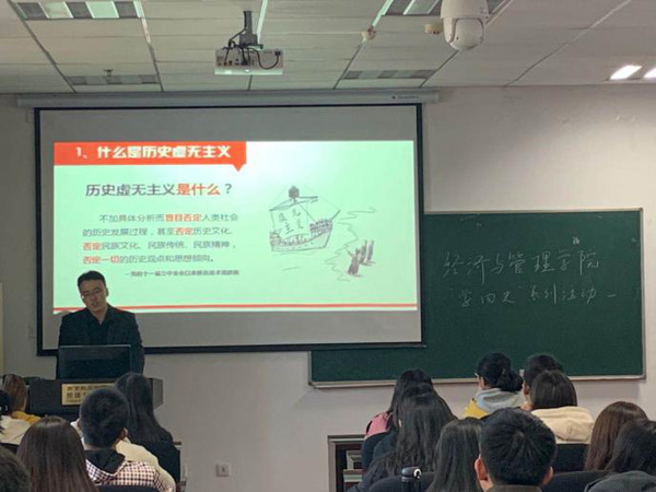 接着,他指出历史虚无主义的三大主要表现:丑化、否定领袖人物;用片面否定全部,用支流否定主流;用所谓“科学”解构、抹黑英雄人物。他通过互动交流的形式,使同学们掌握历史唯物主义方法,对于老一辈领导人有了更加深刻、全面的认识;针对一些战争题材影视作品的价值观导向问题,他进行了深入而理性分析,引导同学们明辨是非、独立思考;同时,他引用血战上甘岭、鏖战长津湖等一系列客观史实,深情讲述了以“钢少气多”力克“钢多气少”的惊天地、泣鬼神的雄壮史诗。