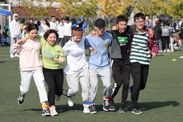 随着两位辅导员打响发令枪,本次趣味运动会正式开始。活动集趣味性、协作性和竞争性于一体,设立六人七足、十人八字跳长绳、背夹球接力三个项目。
