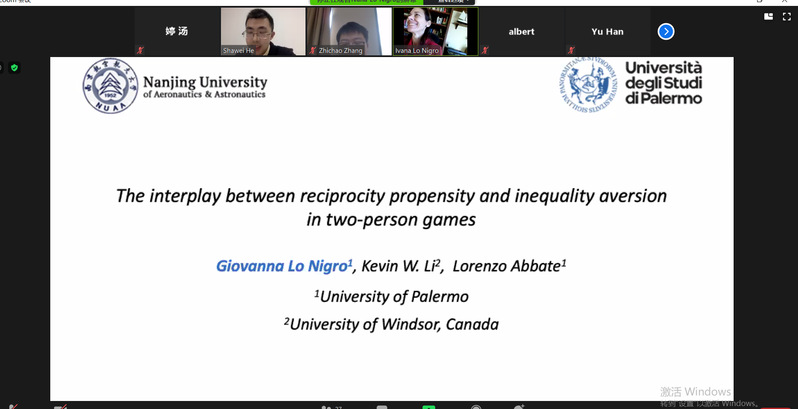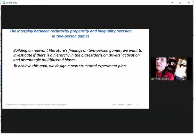 12月28日下午,意大利巴勒莫大学教授Giovanna Lo Nigro受学院智能决策与风险分析研究所邀请,在ZOOM会议作了题为“The interplay of reciprocity propensity and inequality aversion in two-person games”的学术报告。漫画柜 徐海燕教授、何沙玮副教授等教师及部分硕、博研究生线上参加了Giovanna Lo Nigro的报告分享,本次学术报告由何沙玮主持。