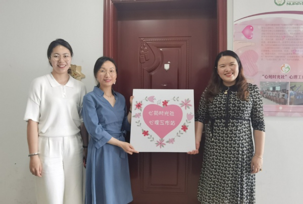 最后,胡心雨带领大家参观了“心苑时光社”心理工作站,漫画柜 划拨506办公室作为心理健康室,为心理健康教育提供场地支持,开设“心灵图书&解压角”,摆放有关心理减压、人际交往、导学关系等方面的心理书籍和减压工具,旨在为学生创造一个舒缓心情的绝佳场所。涂志宏、陈瑜共同为心理工作站以及心灵解压角挂牌。