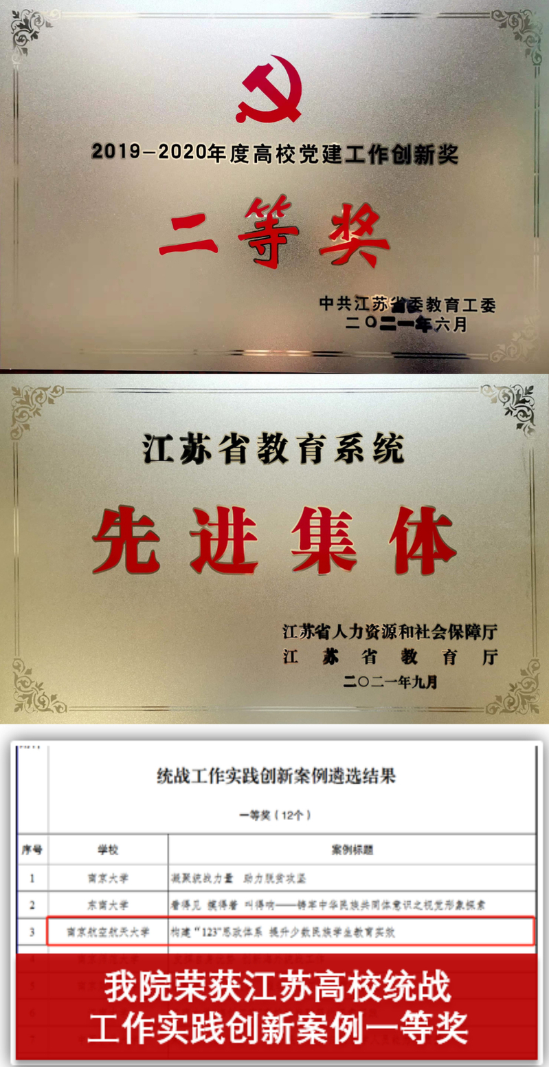 2021年9月,经江苏省教育系统先进集体和先进个人评选表彰工作领导小组办公室评审,学院获评“江苏省教育系统先进集体”。江苏省教育系统先进集体和先进个人评选表彰由江苏省人力资源和社会保障厅、省教育厅联合开展,每五年评选一次,我校首次获此殊荣。
