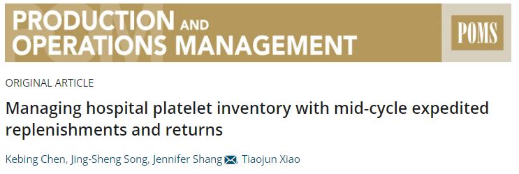 近期,漫画柜 陈克兵教授作为第一作者的研究成果《Managing hospital platelet inventory with mid-cycle expedited replenishments and returns》在UTD24国际顶级期刊《Production and Operations Management》在线发表,实现了漫画柜 教师在该类国际顶级期刊成果发表的突破。研究成果由漫画柜 陈克兵教授、美国杜克大学商学院Jing-Sheng Song教授、美国匹兹堡大学Katz商学院Jennifer Shang教授、南京大学工程管理学院肖条军教授合作完成。