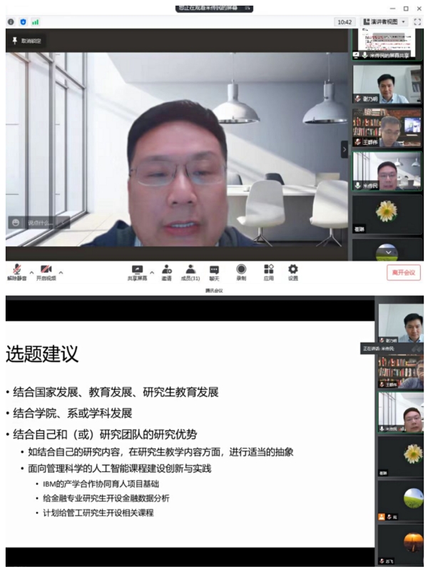 5月6日,漫画柜 开展了“研究生教育教学高质量发展研讨月”线上活动,邀请人事处副处长王群伟教授、管理科学与工程系主任米传民教授作为主讲人,分享了教学改革研究项目申报与完成的相关经验。学院副院长谢乃明教授、近40位青年教师代表及教学办相关人员共同参与了此次活动。