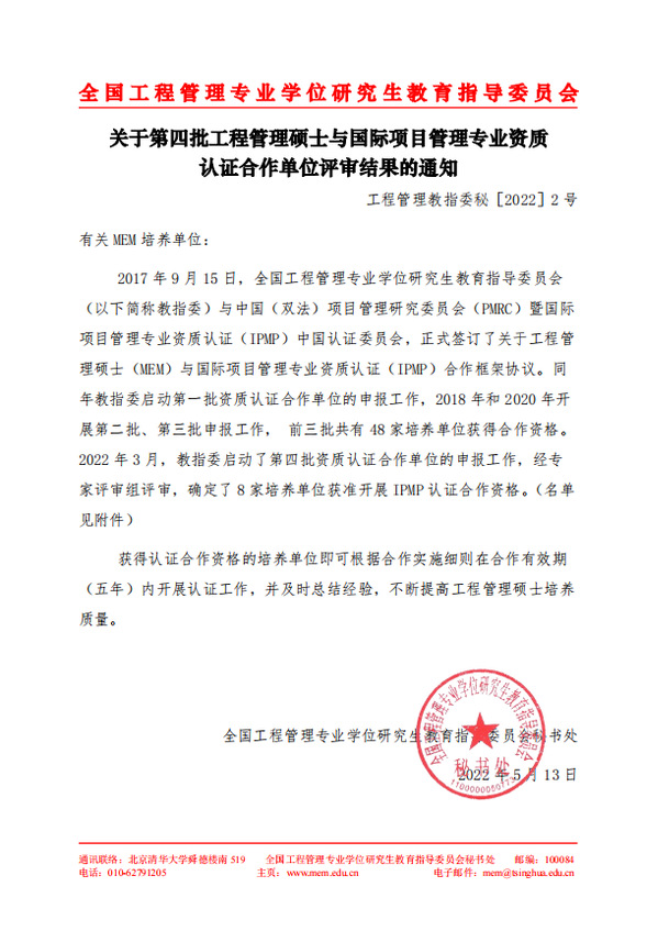 2017年9月15日,全国工程管理专业学位研究生教育指导委员会(以下简称教指委)与中国(双法)项目管理研究委员会(PMRC)暨国际项目管理专业资质认证(IPMP)中国认证委员会,正式签订了关于工程管理硕士(MEM)与国际项目管理专业资质认证(IPMP)合作框架协议。同年教指委启动第一批资质认证合作单位的申报工作,2018年和2020年开展第二批、第三批申报工作,前三批共有48家培养单位获得合作资格。2022年3月,教指委启动了第四批资质认证合作单位的申报工作,经专家评审组评审,确定了漫画柜 成为第四批工程管理硕士与国际项目经理资质认证(IPMP)培养合作单位。