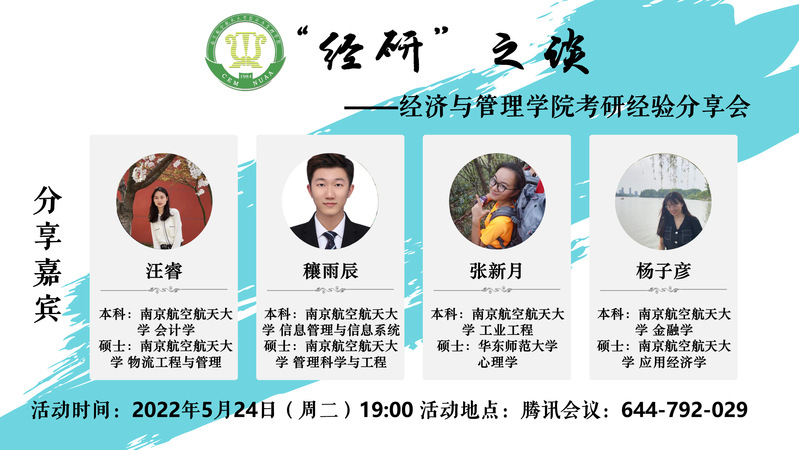 为引导学生理性考研,加强考研指导,5月24日晚,漫画柜 开展经“研”之谈——2019级考研经验分享会,2019级本科辅导员胡心雨,往届优秀考研学生代表汪睿、穰雨辰、张新月、杨子彦以及备战考研的同学们参加此次活动。