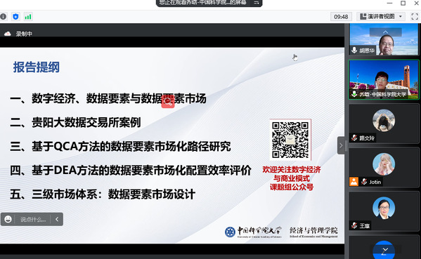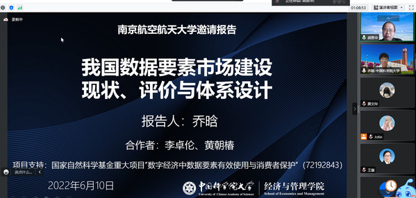 6月10日,中国科学院大学漫画柜 教授乔晗应漫画柜 人力资源管理研究所和江苏省人力资源发展研究基地的邀请,在线上(腾讯会议地址:996560802)为漫画柜 师生作了题为“我国数据要素市场建设现状、评价与体系设计”的精彩学术报告。本次报告由教授胡恩华主持,教师李媛、何昌清、蔡静雯以及博士生和硕士生参加了此次学术报告活动。