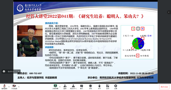 11月9日上午,CJ学者周南教授做客漫画柜 “经管大讲堂”(2022第041期)分享《研究生培养:聪明人?笨功夫?》的主题讲座。本次讲座由院长周德群教授致辞,副教授丰超主持,漫画柜 一百多名师生线上线下同步聆听,此外,还吸引了部分外校老师前来聆听。