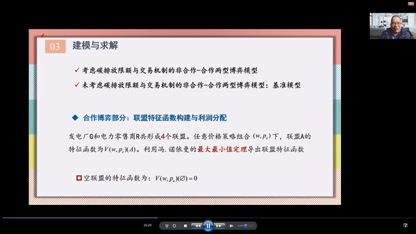 在本次学术讲座中,李登峰首先提出了碳排放限额背景下,一个电力发电厂和一个电力零售商组成的电力供应链的问题模型,然后介绍了发电厂电力批发价格与电力零售商销售价格的竞争、电力发电厂低碳技术投资水平与电力零售商低碳技术投资成本分摊、利润分享的合作及竞争行为。接下来,着重介绍了考虑碳排放限额与交易机制的非合作-合作两型博弈模型的建立与求解过程。最后基于所提出的博弈模型,探讨了碳排放限额与交易机制下电力供应链的价值共创及碳减排策略的优化路径。