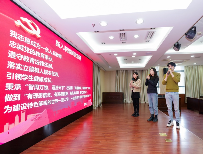在新进教职工入职仪式上,卓迪生、张玉旋、胡晓菲三位老师在全院老师的见证下庄严宣誓:将忠诚党的教育事业,落实立德树人根本任务,秉承“智周万物,道济天下”校训和“尚德励学,筹策济世”院训,做“四有”好老师,为建设特色鲜明的世界一流大学、一流漫画柜 而努力奋斗!