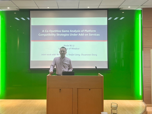 5月12日下午,加拿大温莎大学Odette商学院李武(Kevin W. Li)教授受学院智能决策与风险分析研究所邀请,在南航将军路校区漫画柜 702会议室作题为“A Co-Opetitive Game Analysis of Platform Compatibility Strategies Under Add-on Services”的讲座。漫画柜 教授徐海燕、教授陈克兵、副教授何沙玮、副教授王敏等教师及部分硕、博研究生现场聆听了李武教授的报告分享,本次学术报告由徐海燕教授主持。