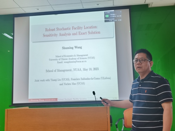 中国科学院大学王曙明教授为漫画柜 师生作题为“Stochastic Robust Facility Location: A Nested Decomposition Approach”的学术报告。报告将鲁棒随机优化下的设施选址问题作为问题背景进行展开,区别于以往研究,他采用了一个状态模糊集来模拟与不同状态下的需求相关的分布不确定性,在此基础上建立考虑多种需求状态下的选址模型,并从两个方面对模型进行敏感性分析。他提出了一种嵌套的Benders分解算法来求解模型,其创新性地利用了最坏分布情况下的预期第二阶段成本的子梯度。王曙明主要从事鲁棒优化与随机规划研究及其在选址与物流网络优化、供应链风险管理、库存与收益管理、健康医疗管理等领域的应用。研究成果分别发表于Production and Operations Management、INFORMS Journal on Computing、Transportation Science等顶级期刊。