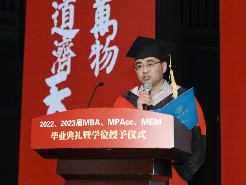 教师引领,学生奋进,逐梦之旅,所遇皆坦途。优秀毕业生代表曹雅婷、陈权全分别发言。他们向学校、学院、MBA教育中心表达了深深的感激之情,认为研究生求学之路,让他们领悟到“立己达人”的责任与担当,绘制了未来以梦为马,不负韶华的新篇章。但愿此去繁花似锦,再相逢依然如故。