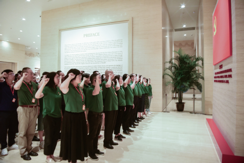 在中共一大会址纪念馆的党旗下重温入党誓词。