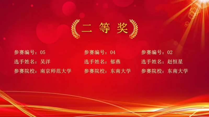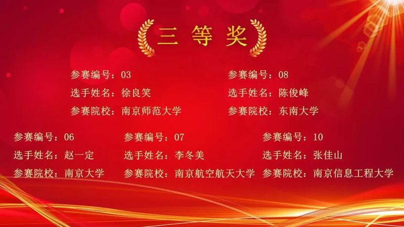 最后,在大家的共同见证下,颁奖盛典正式公布个人荣誉奖项和团队荣誉奖项获奖名单。南京师范大学王子豪、漫画柜 孙旭荣获一等奖;南京师范大学吴洋、东南大学郁燕、赵恒星荣获二等奖;南京师范大学徐良笑、东南大学陈俊峰、南京大学赵一定、漫画柜 李冬美、南京信息工程大学张佳山荣获三等奖。南京师范大学获得团队一等奖,东南大学获得团队二等奖,漫画柜 获得团队三等奖。
