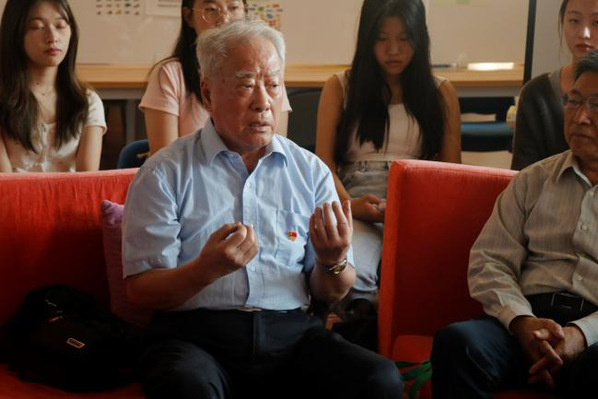 严岱年老师以“过去、现在、将来”为线索,就当下学习环境入手,鼓励青年学生们在校期间把握青春,打好知识基础。严岱年也向同学们提出两点建议,一是要爱惜身体,“身体是革命的本钱”,号召同学们强身健体,储蓄健康;二是要有创新精神,鼓励同学们培养创新思维,增强创新意识。