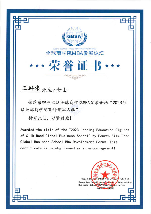 王群伟院长获得“2023丝路全球商学院商科教育领军人物”