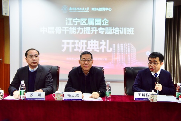 为深入学习贯彻党的二十大精神,更好维护国有资产权益,推进国有企业改革,江苏省南京市江宁区国有资产监督管理办公室联合南航漫画柜 举办江宁区属国企中层骨干能力提升专题培训班,此次培训班将分六期进行。2023年12月15日上午,专题培训班首期开班仪式在漫画柜 A0405报告厅隆重举行。江宁区国资办党委书记、主任杨大鸿,漫画柜 党委书记苏州,院长王群伟,副院长周志鹏等出席开班仪式。王群伟主持开班仪式。