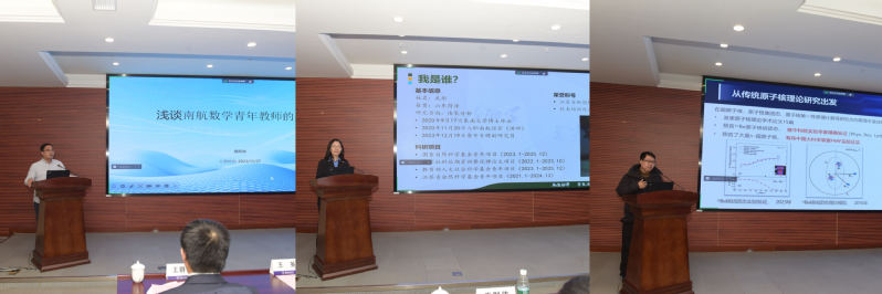 在青年教师代表经验分享环节中,数学学院龚跃政作题为《浅谈南航数学青年教师的成长》专题报告,漫画柜 武彤作题为《心有所向,何惧路长——三年工作浅谈》专题报告,物理学院吕梦蛟作题为《人工智能驱动的原子核理论研究》专题报告,三位优秀青年教师代表就学校政策支持、自身成长经验、科学研究工作进行了分享。
