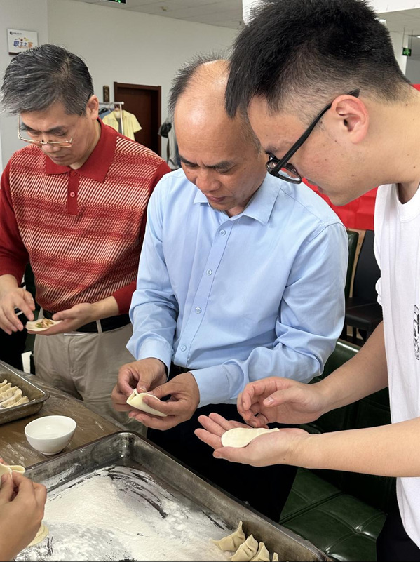 活动以包饺子的形式展开。饺子,在中国传统文化中,象征着团圆、幸福和吉祥。在现场温馨融洽的氛围中,老教授们神采奕奕,相谈甚欢,和现场的同学们一边包饺子,一边亲切交流,其乐融融。