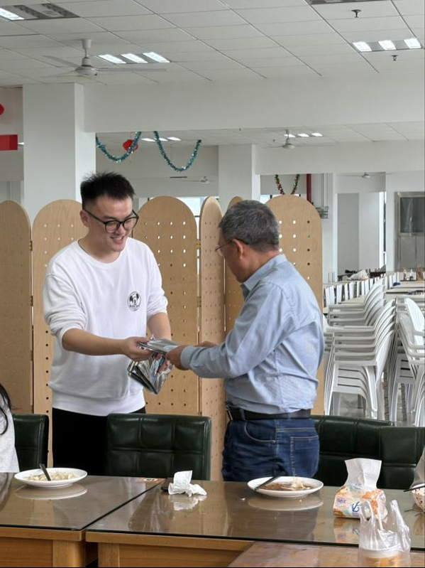热腾腾的饺子上来后,老师和同学边吃边聊。从职业规划到就业指导,从金融体系到社会热点,在欢声笑语间同学们放下了开始的羞涩,和老师们相谈甚欢。吃饺子,交好运,活动最后,同学们还向教授们送上自己亲手制作的香囊和祝福贺卡,传递美好祝福,更增进了彼此之间的情感交流。