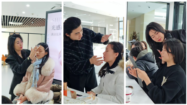 同时,运用九大品味风格色彩理论进行分析,根据每个人不同的肤色,发色和眼睛的颜色等,从最初的底妆技巧、眼妆及唇妆的精致打造,再到丝巾配饰的点睛之笔,手把手地逐一指导师生们体验如何打造柔光感和幼颜感妆容。打底、描眉、画眼、涂唇,每一步都细致入微,每一步都充满了期待和惊喜。