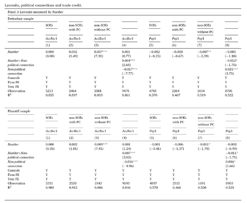 This paper explores the interplay between politics and law enforcement in China and its effects on firm financing decisions. By examining a sample of corporate lawsuits involving listed firms in China, we find that politically connected firms are less likely to be defendants, have higher win rates, and experience shorter litigation durations than non-connected firms. Additionally, we observe that firms with higher legal risk extend more accounts receivable and receive less accounts payable, but this relationship holds only for non-connected firms. Our findings support the financing advantage theory for politically connected firms and the legal risk compensation view for non-connected firms. Moreover, reforms in China’s judicial system do not appear to mitigate the disadvantages faced by non-connected firms in terms of lawsuit outcomes and trade credit provision. Our findings suggest that well-functioned judicial independence might be still lacking in China, and that political connections continue to negatively impact law enforcement and corporate policies.